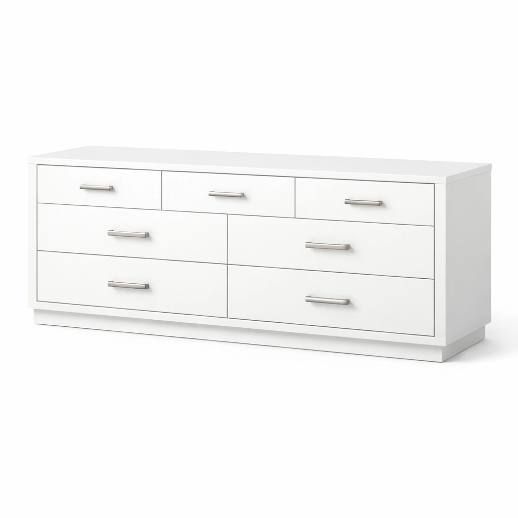 Cassettiera in legno bianco con cassetti e manici in metallo