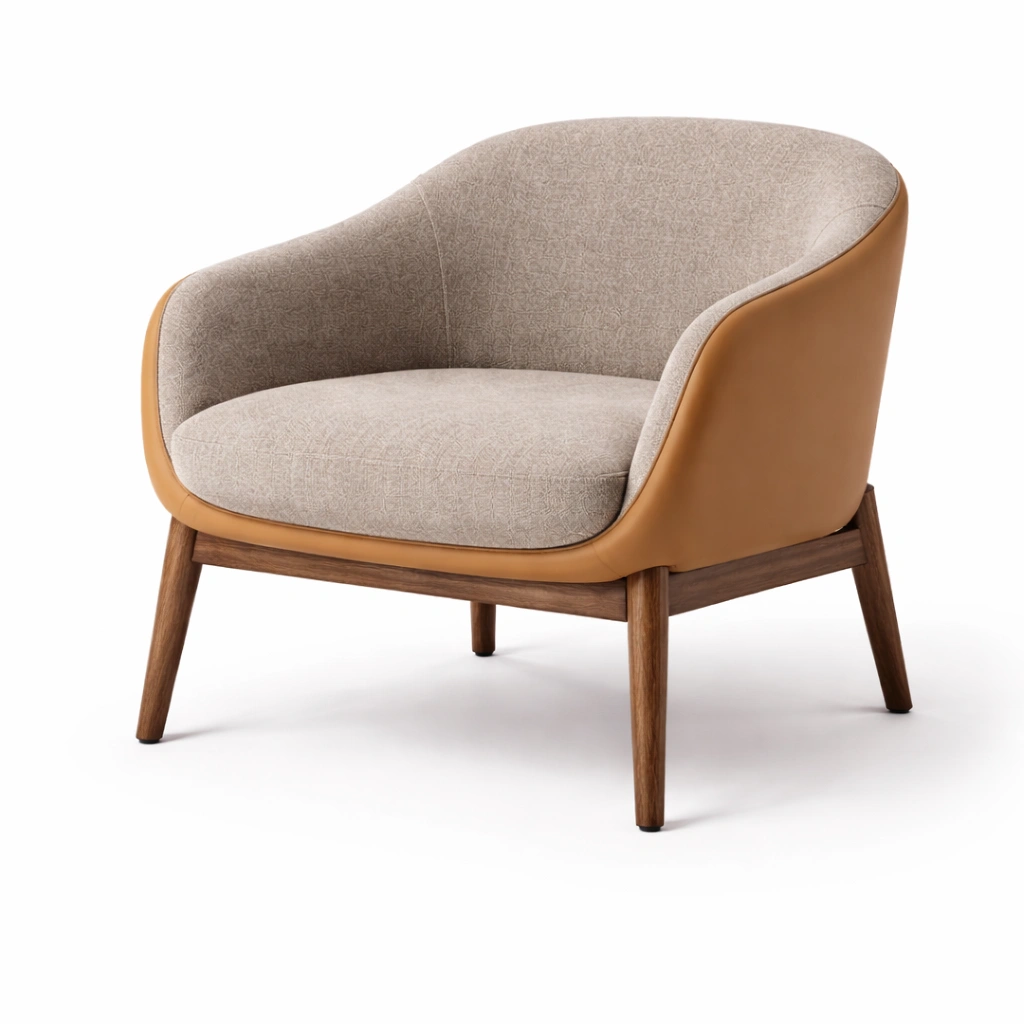 Poltrona in tessuto e similpelle con struttura in legno massello