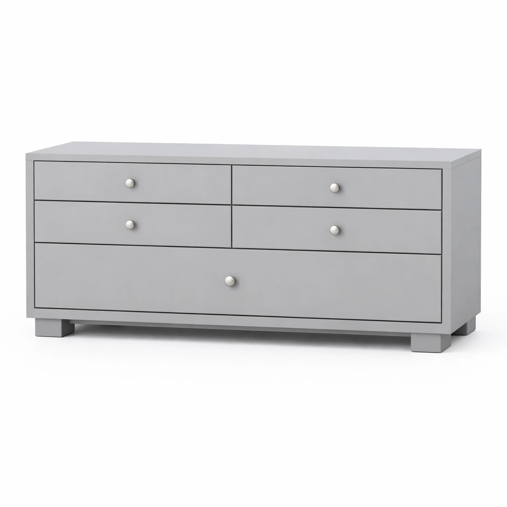 La cassettiera è realizzata in legno MDF con finitura grigia. Misura 120 cm di lunghezza, 40 cm di larghezza e 60 cm di altezza. Peso complessivo 35 kg. Dispone di 5 cassetti per lo stoccaggio di indumenti e accessori.