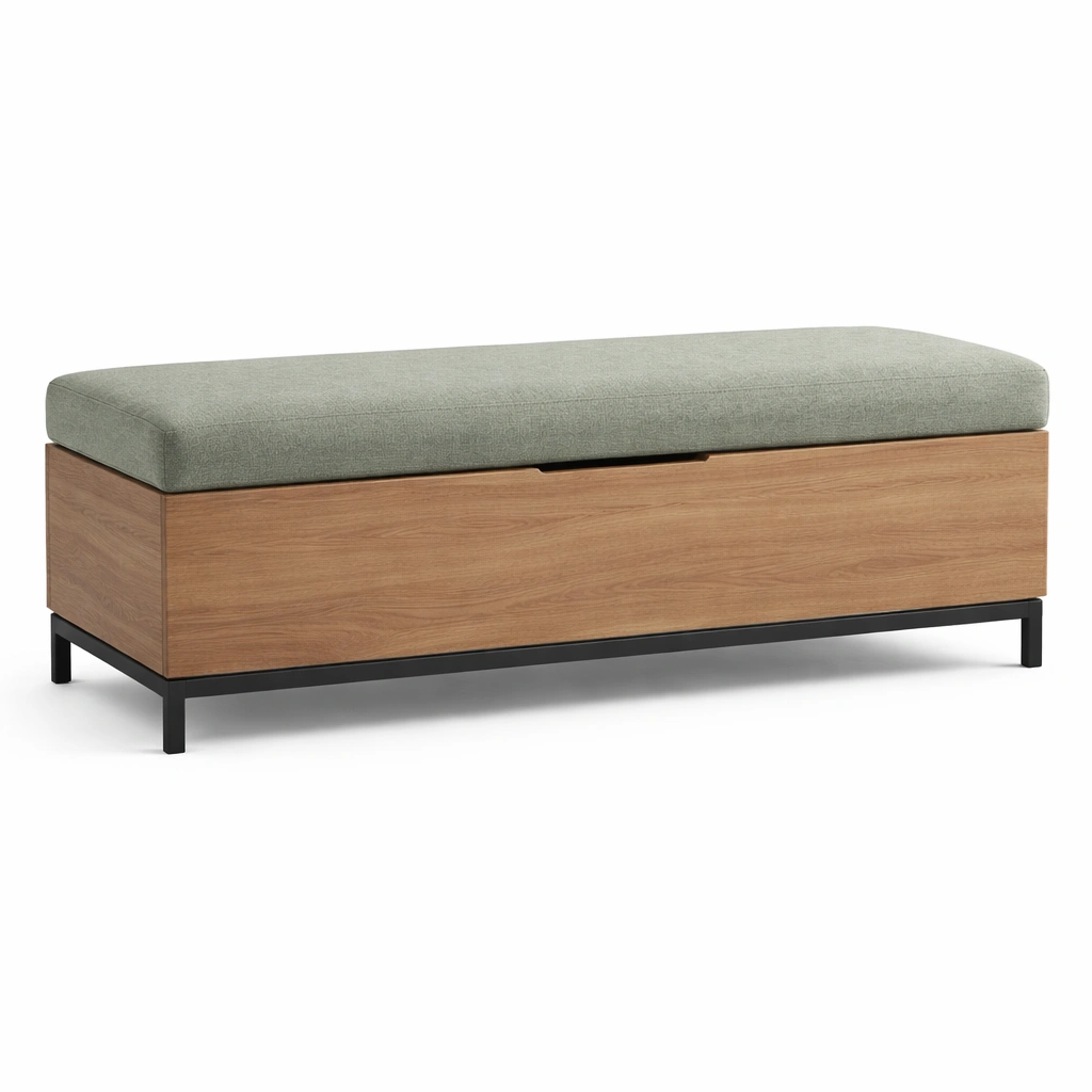 La panca contenitore è composta da una struttura in legno MDF, con base in metallo verniciato nero e rivestimento in tessuto di poliestere verde. Imbottitura in schiuma poliuretanica. Dimensioni: 120 cm lunghezza, 40 cm larghezza, 45 cm altezza. Funzione principale: seduta e spazio contenitore. Capacità di carico: 100 kg. Pulizia con panno umido.